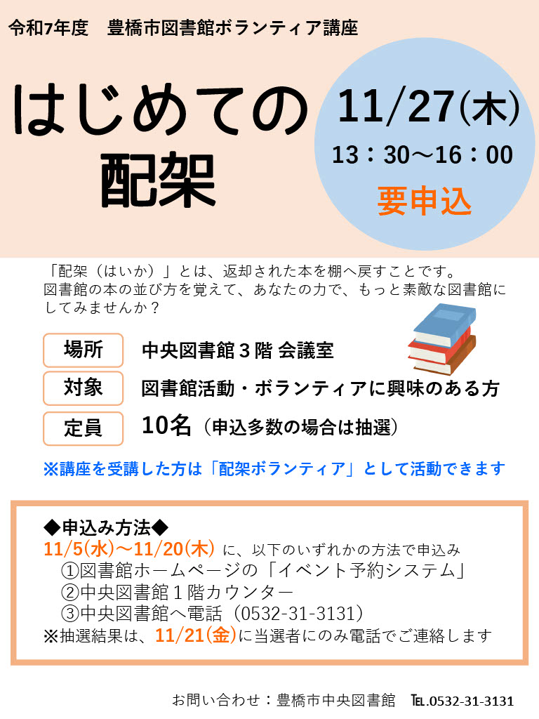 図書館の本を正しい棚に戻す作業を「配架(はいか)」といいます。 豊橋市中央図書館では、この配架の作業をお手伝いしていただく「配架ボランティア」を募集します。新たな「図書館ボランティア」として活躍していただくため、配架に必要な知識を学ぶ講義と、実際に棚に本を戻す実習を組み合わせた講座を開催します。
