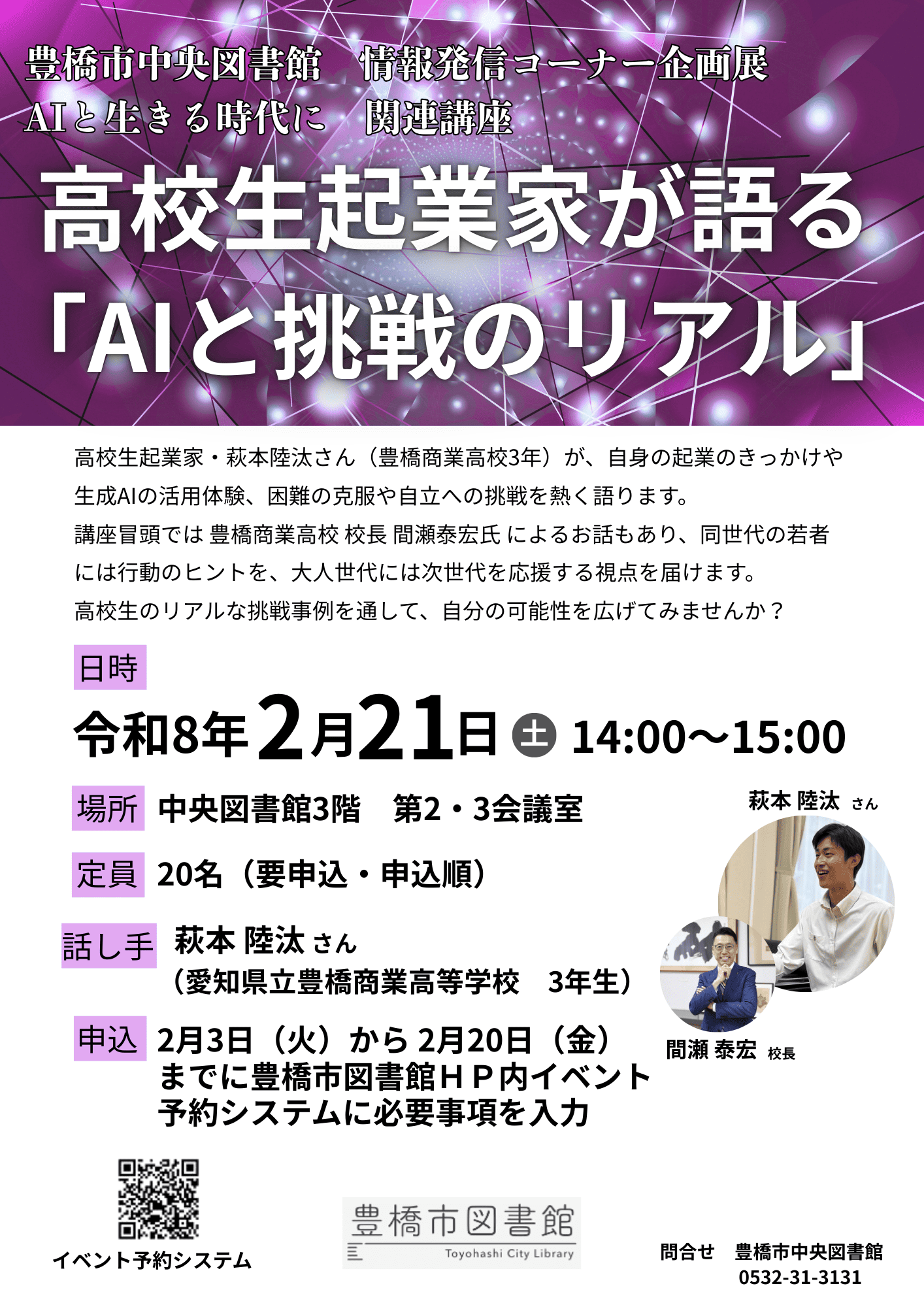 高校生起業家・萩本陸汰さん(豊橋商業高校3年)が、自身の起業のきっかけや生成AIの活用体験、困難の克服や自立への挑戦を熱く語ります。 講座冒頭では 豊橋商業高校 校長 間瀬泰宏氏 によるお話もあり、同世代の若者には行動のヒントを、大人世代には次世代を応援する視点を届けます。