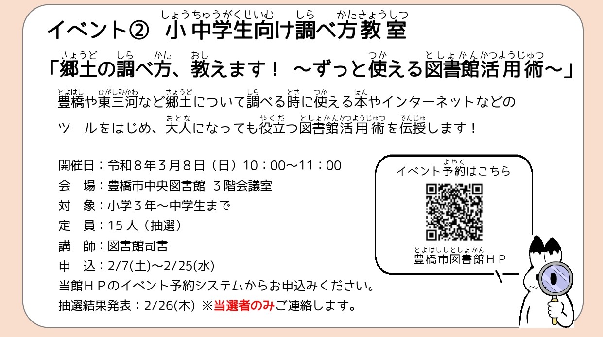 図書館資料展「郷土を探る!-先人たちが紡いできた郷土研究-」の関連イベントです。 小中学生向けに、豊橋や東三河など郷土について調べる時に使える本やインターネットなどのツールをはじめ、大人になっても役立つ図書館活用術を紹介します! ※追加募集のため、先着順とします。申込みができた方はご参加いただけます。 対 象:小学3年~中学生まで(対象学年の児童・生徒の保護者も申込可) 持ち物:筆記用具
